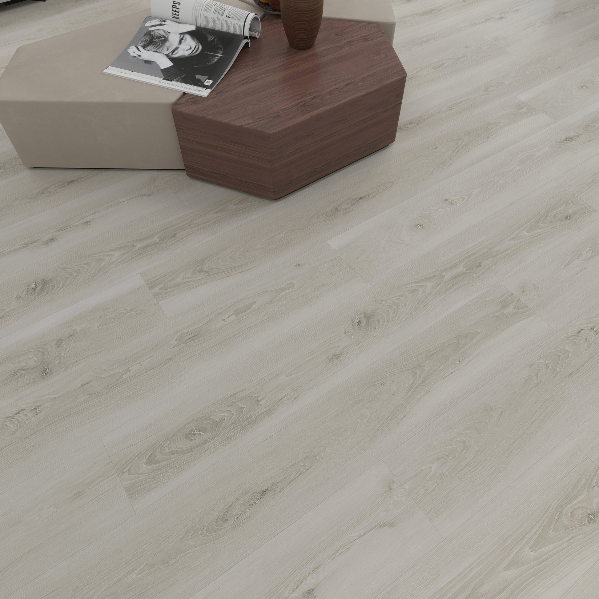The planks are 7 inches wide and 48 inches long, providing a sleek and modern look that mimics various types of hardwood flooring patterns.